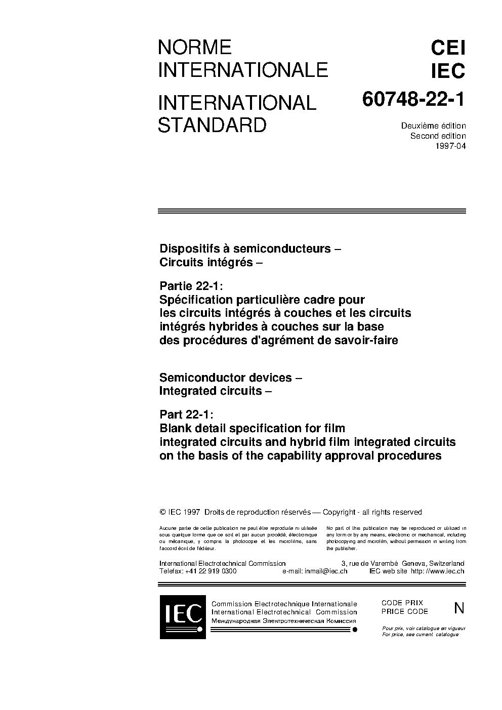 IEC 60748-22-1:1997 Semiconductor devices - Integrated circuits - Part 22-1: Blank detail specification for film integrated circuits and hybrid film integrated circuits on the basis of the capability approval procedures