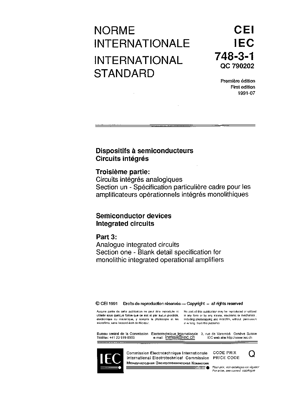 IEC 60748-3-1:1991 Semiconductor devices. Integrated circuits - Part 3: Analogue integrated circuits - Section one: Blank detail specification for monolithic integrated operational amplifiers