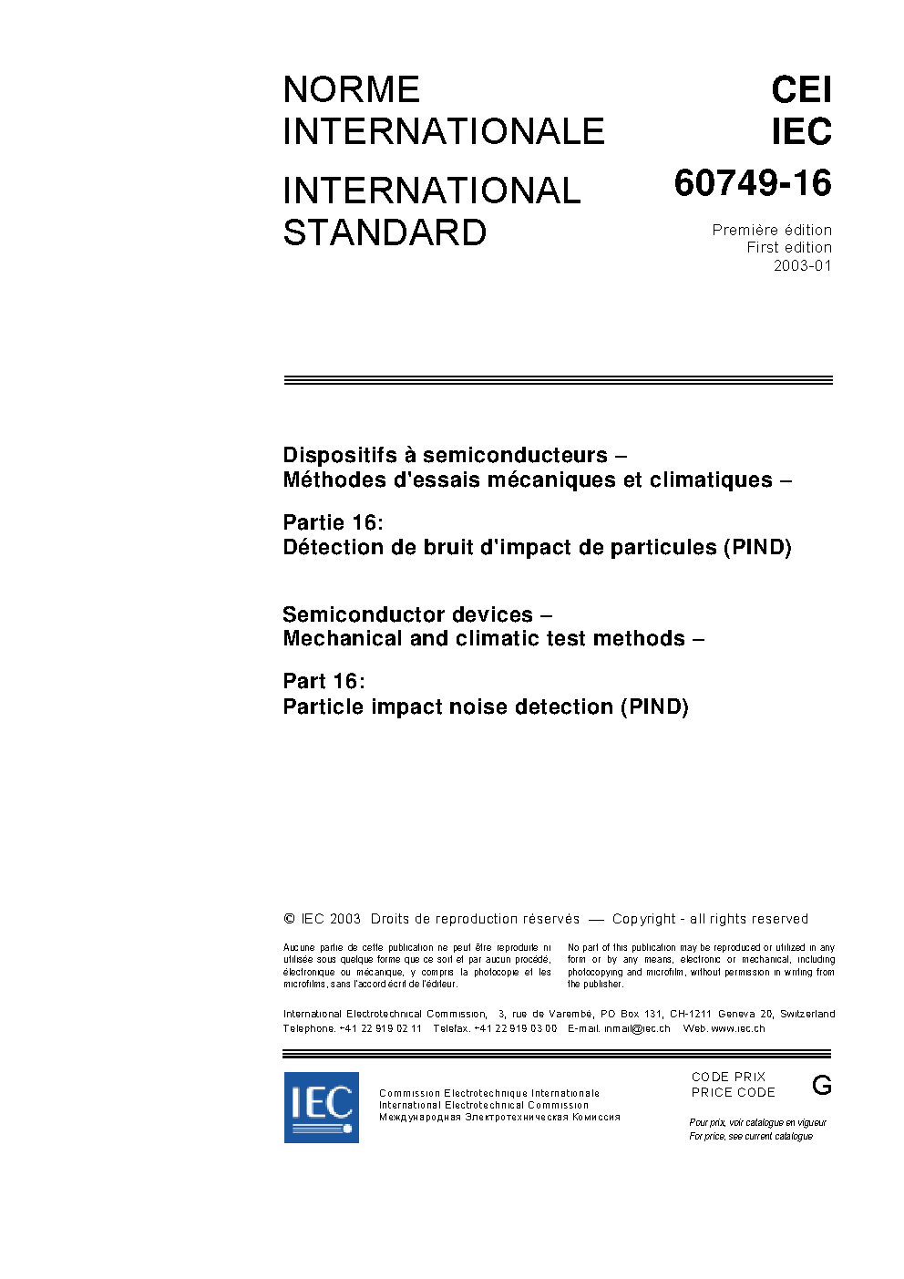 IEC 60749-16:2003 Semiconductor devices - Mechanical and climatic test methods - Part 16: Particle impact noise detection (PIND)