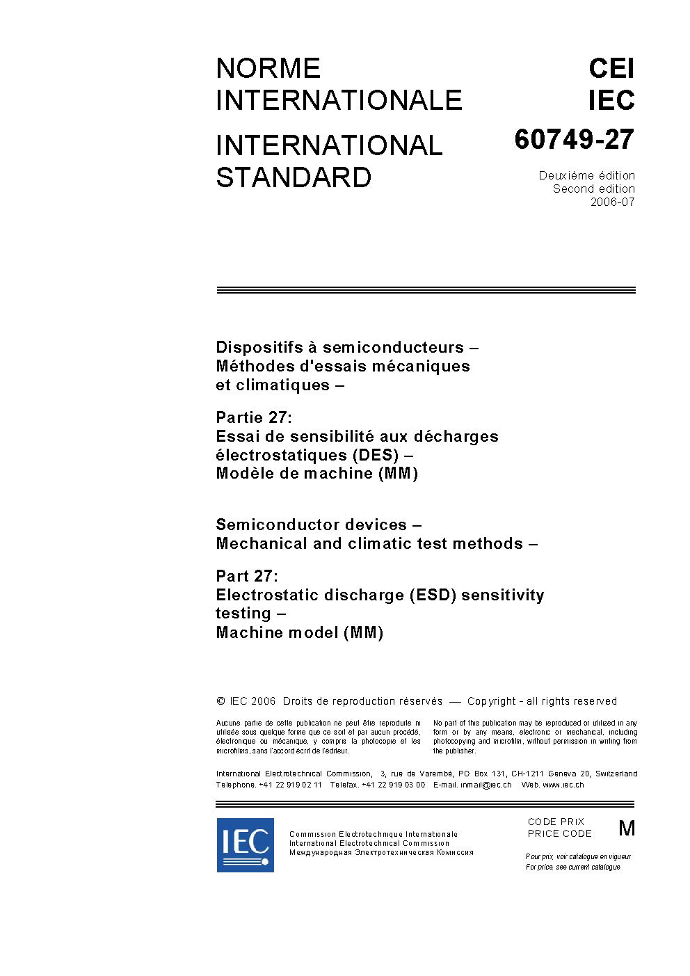 IEC 60749-27:2006/AMD1:2012 Amendment 1 - Semiconductor devices - Mechanical and climatic test methods - Part 27: Electrostatic discharge (ESD) sensitivity testing - Machine model (MM)