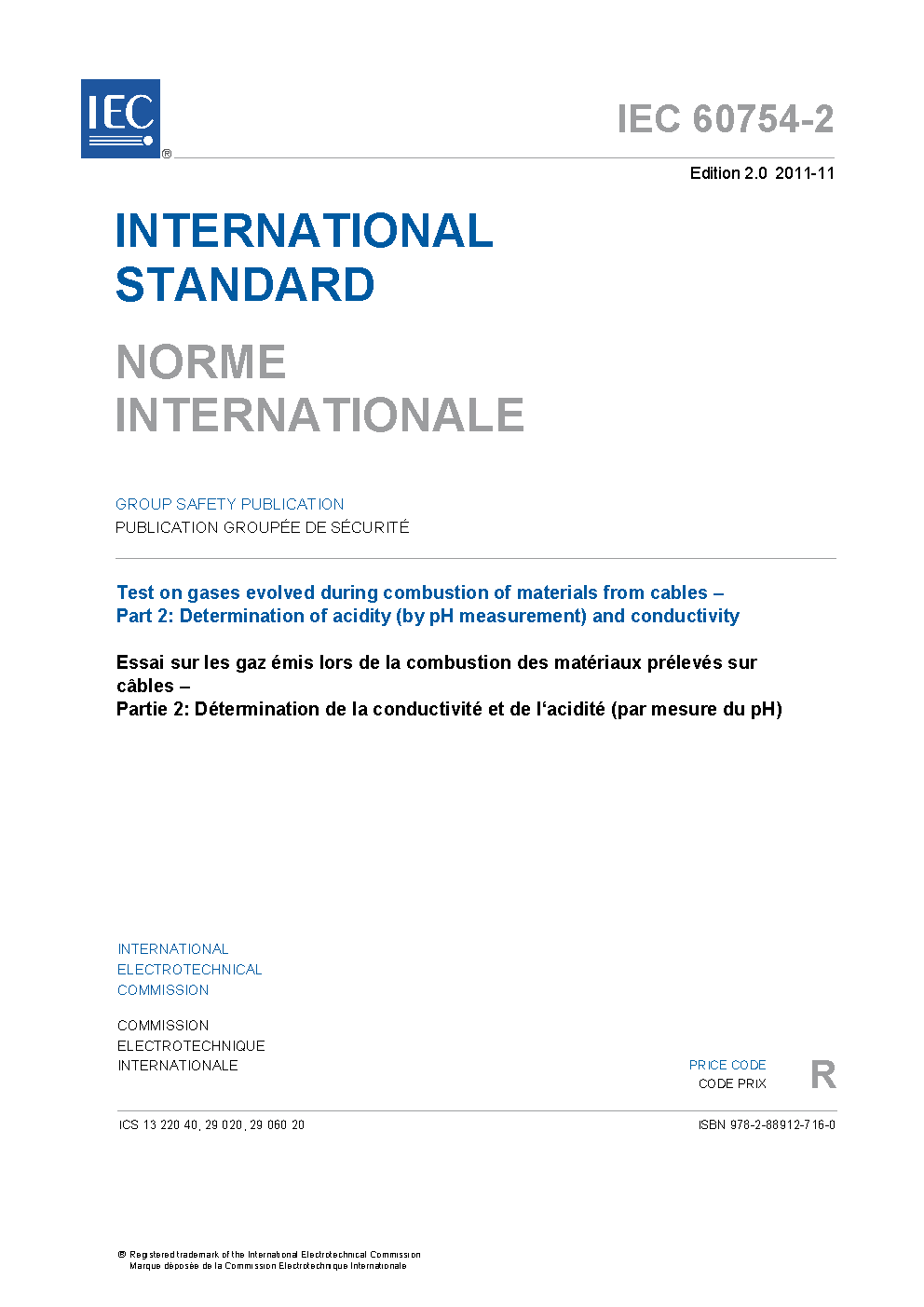 IEC 60754-2:2011 Test on gases evolved during combustion of materials from cables - Part 2: Determination of acidity (by pH measurement) and conductivity