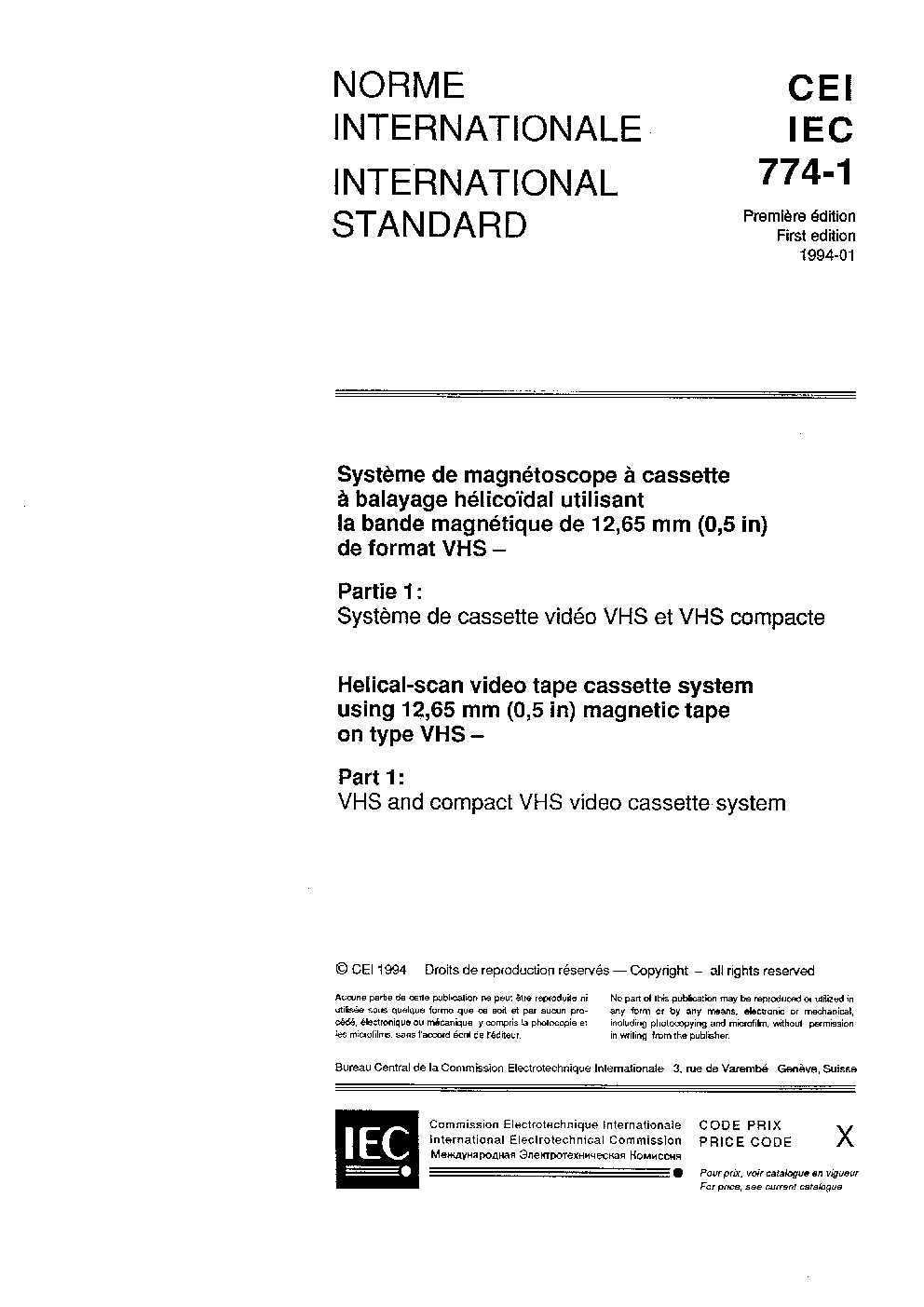 IEC 60774-1:1994 Helical-scan video tape cassette system using 12,65 mm (0,5 in) magnetic tape on type VHS - Part 1: VHS and compact VHS video cassette system