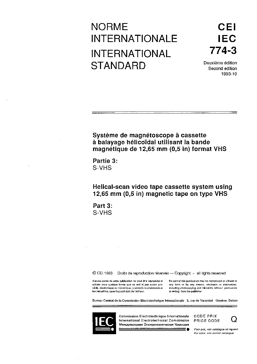 IEC 60774-3:1993 Helical-scan video tape cassette system using 12,65 mm (0,5 in) magnetic tape on type VHS - Part 3: S-VHS
