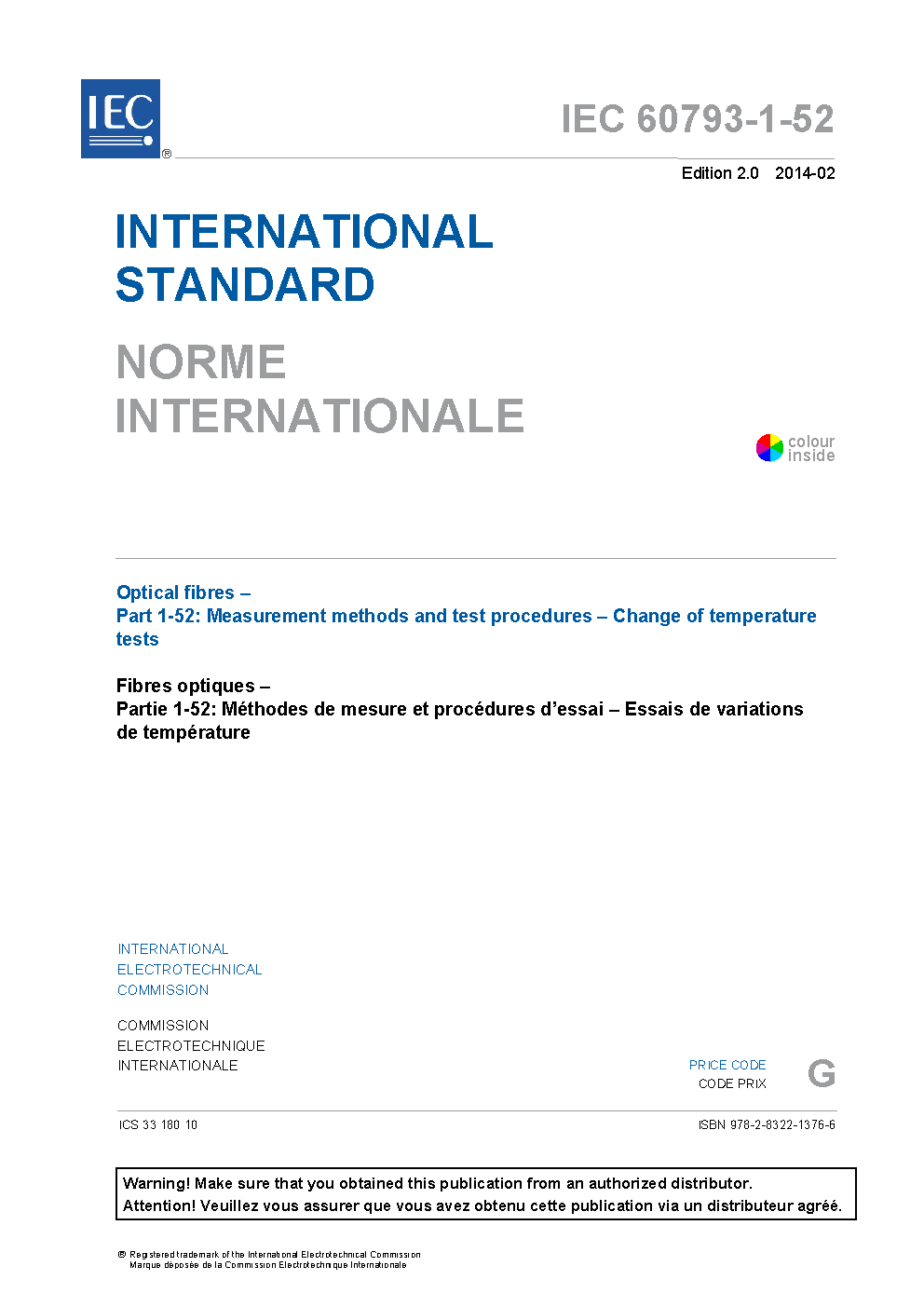 IEC 60793-1-52:2014 Optical fibres - Part 1-52: Measurement methods and test procedures - Change of temperature tests