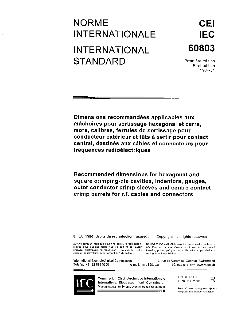 IEC 60803:1984/AMD1:1995 Amendment 1 - Recommended dimensions for hexagonal and square crimping-die cavities, indentors, ganges, outer conductor crimp sleeves and centre contact crimp barrels for R.F. cables and connectors