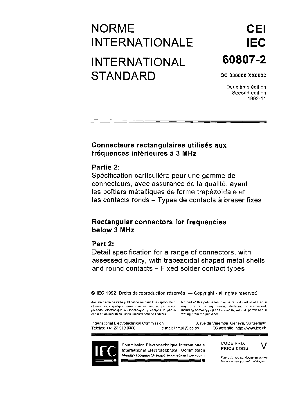 IEC 60807-2:1992/AMD1:1996 Amendment 1 - Rectangular connectors for frequencies below 3 MHz - Part 2: Detail specification for a range of connectors, with assessed quality, with trapezoidal shaped metal shells and round contacts - Fixed solder contact types