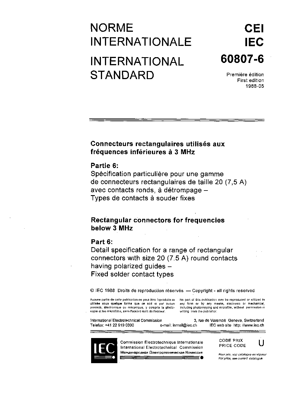 IEC 60807-6:1988 Rectangular connectors for frequencies below 3 MHz - Part 6: Detail specification for a range of rectangular connectors with size 20 (7.5 A) round contacts having polarized guides - Fixed solder contact types