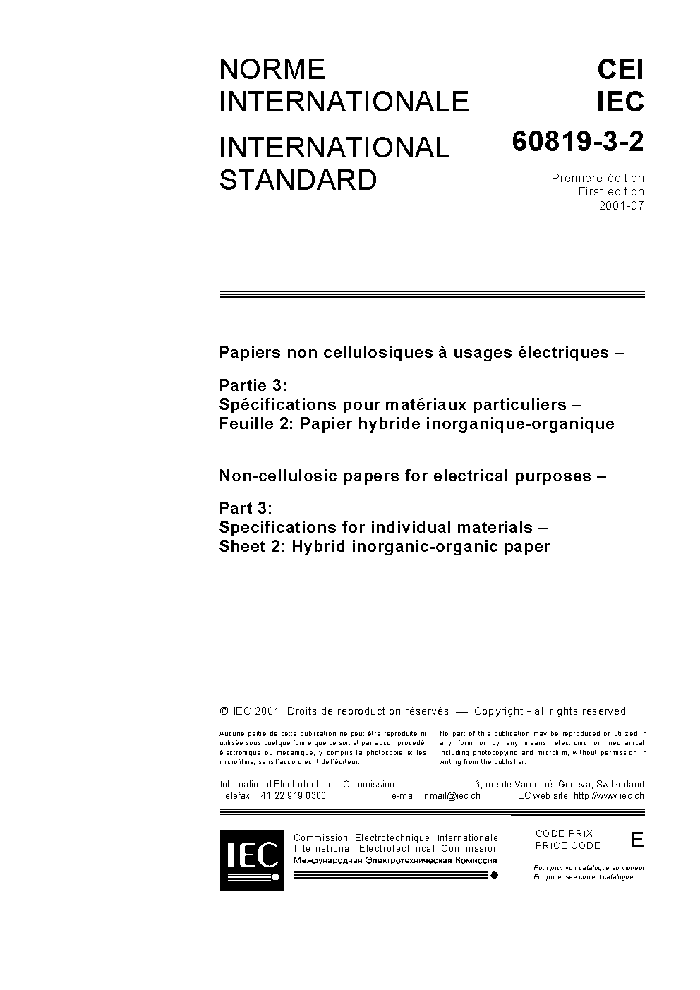 IEC 60819-3-2:2001 Non-cellulosic papers for electrical purposes - Part 3: Specifications for individual materials - Sheet 2: Hybrid inorganic-organic paper