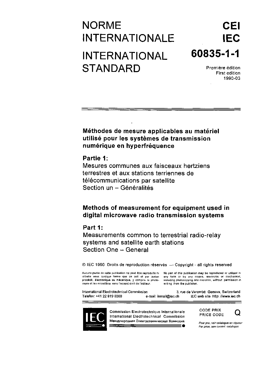 IEC 60835-1-1:1990 Methods of measurement for equipment used in digital microwave radio transmission systems. Part 1: Measurements common to terrestrial radio-relay systems and satellite earth stations - Section One: General
