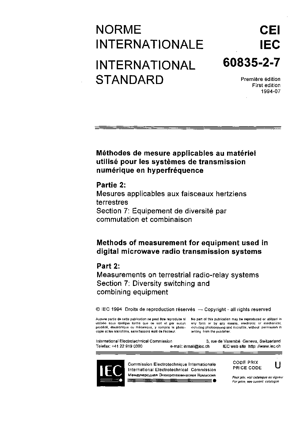 IEC 60835-2-7:1994 Methods of measurement for equipment used in digital microwave radio transmission systems - Part 2: Measurements on terrestrial radio-relay systems - Section 7: Diversity switching and combining equipment