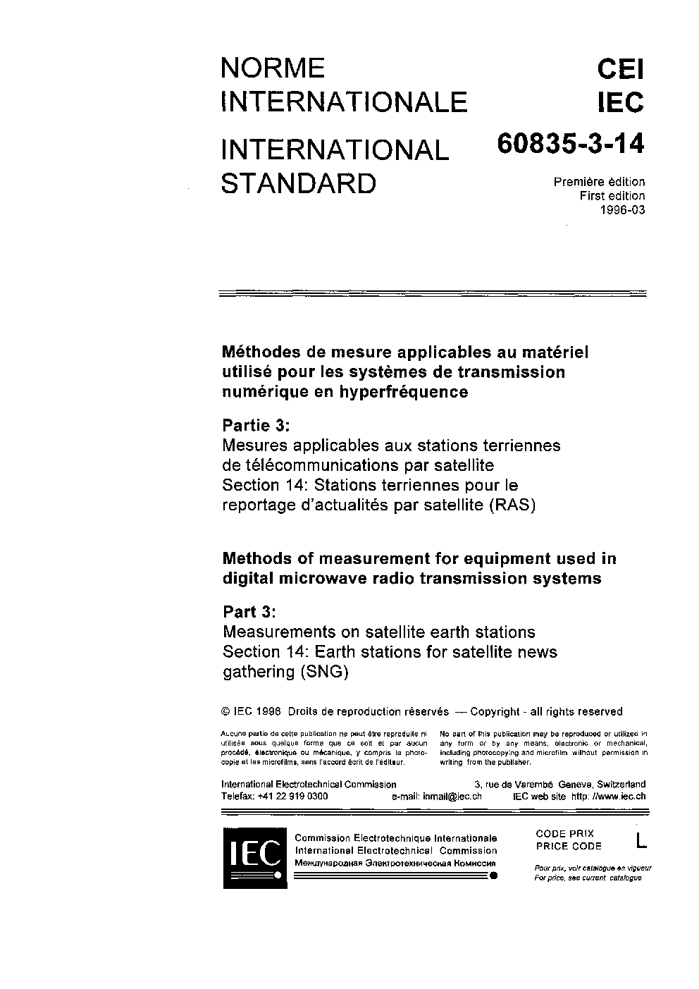 IEC 60835-3-14:1996 Methods of measurement for equipment used in digital microwave radio transmission systems - Part 3: Measurements on satellite earth stations - Section 14: Earth stations for satellite news gathering (SNG)
