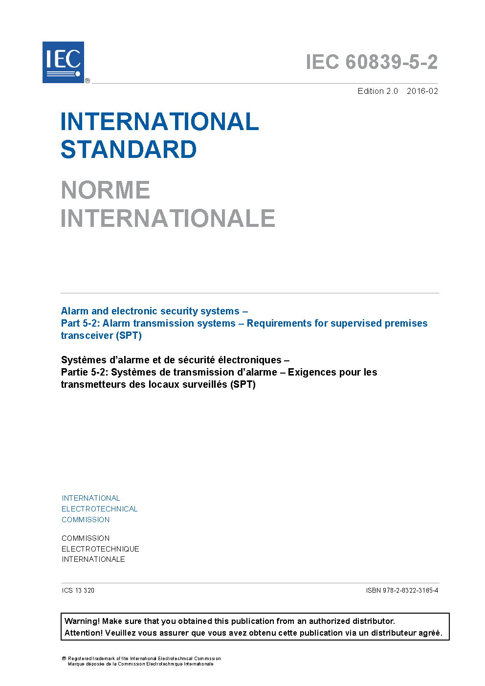 IEC 60839-5-2:2016 Alarm and electronic security systems - Part 5-2: Alarm transmission systems - Requirements for supervised premises transceiver (SPT)