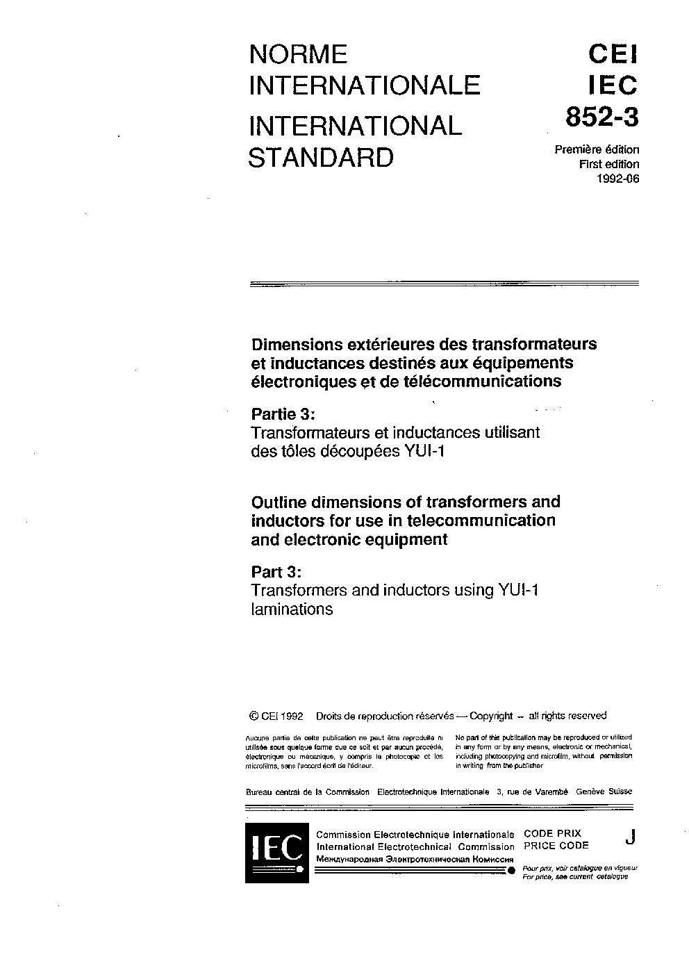 IEC 60852-3:1992 Outline dimensions of transformers and inductors for use in telecommunication and electronic equipment - Part 3: Transformers and inductors using YUI-1 laminations
