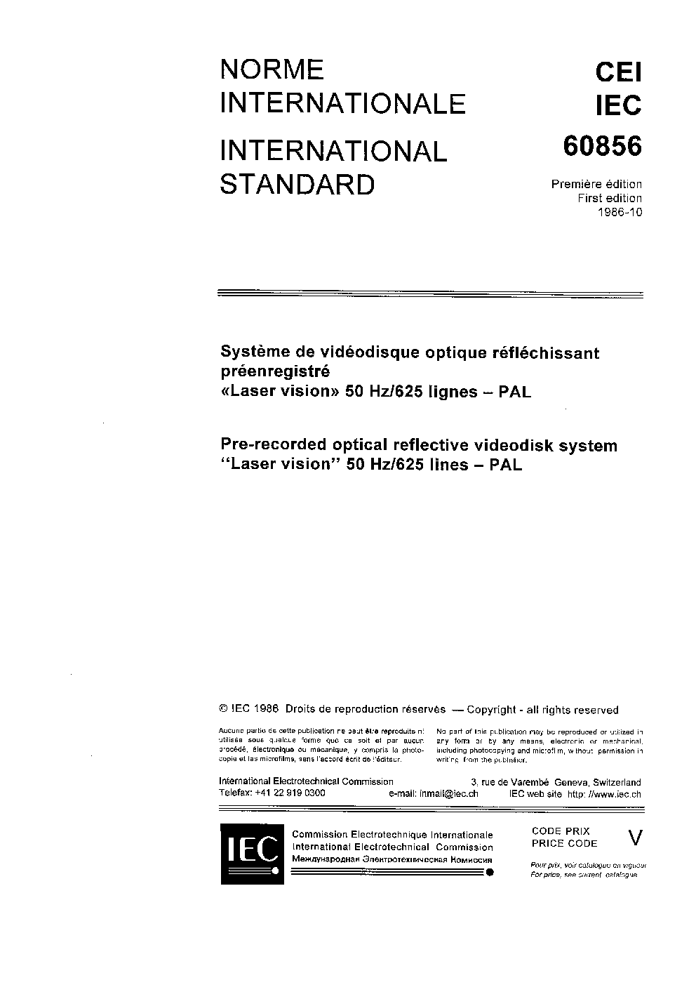 IEC 60856:1986 Pre-recorded optical reflective videodisk system 'Laser vision' 50Hz/625 lines - PAL