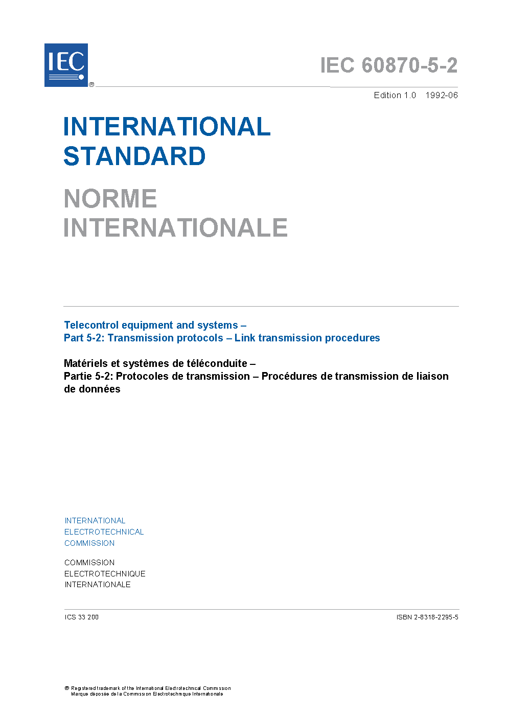 IEC 60870-5-2:1992 Telecontrol equipment and systems - Part 5: Transmission protocols - Section 2: Link transmission procedures