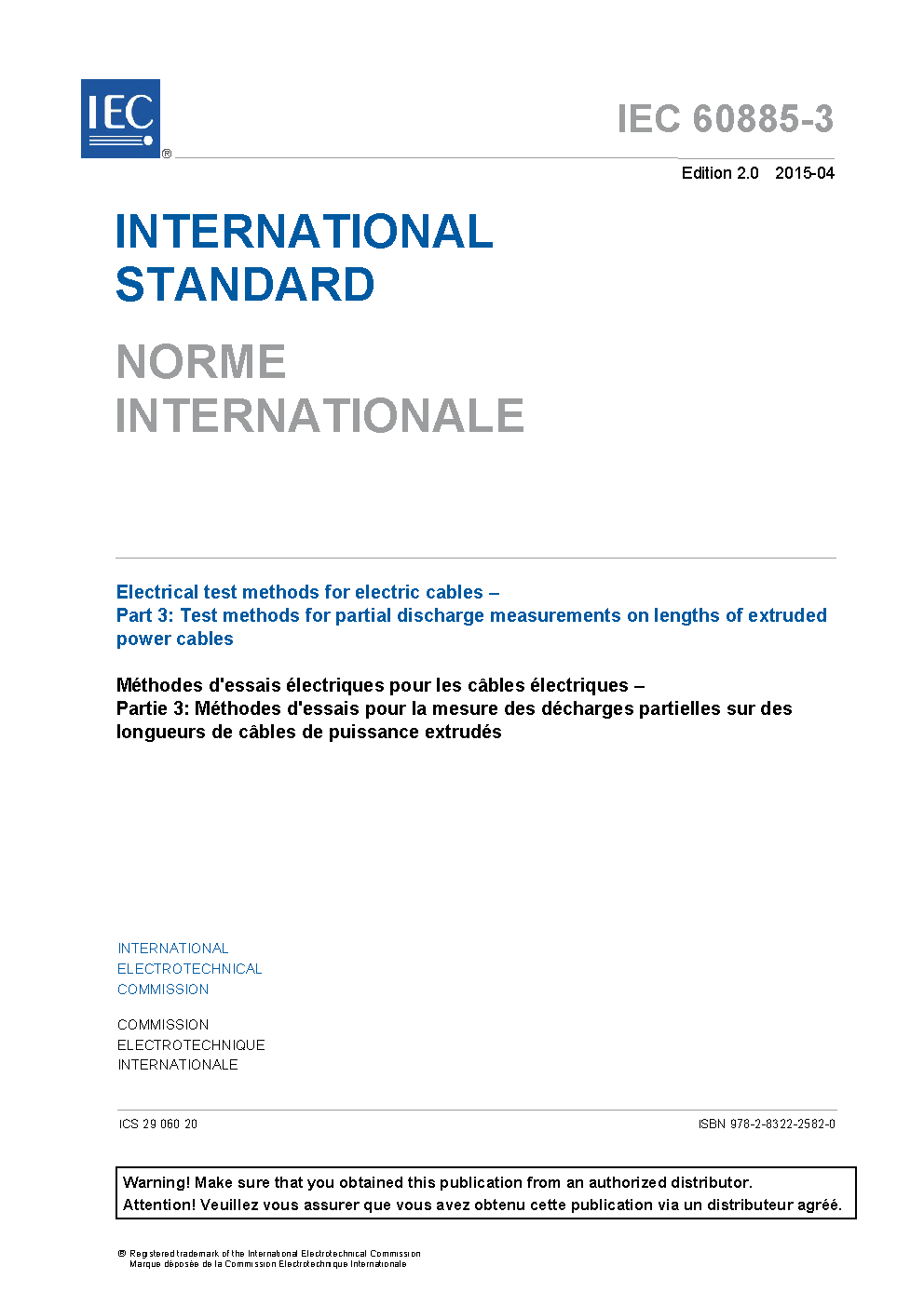 IEC 60885-3:2015 specifies the test methods for partial discharge (PD) measurements on lengths of extruded power cable, but does not include measurements made on installed cable systems. Reference is made to IEC 60270 which gives the techniques and considerations applicable to partial discharge measurements in general. This second edition of IEC 60885-3 cancels and replaces the first edition, published in 1988 and constitutes a technical revision. This edition includes the following significant technical changes with respect to the previous edition: