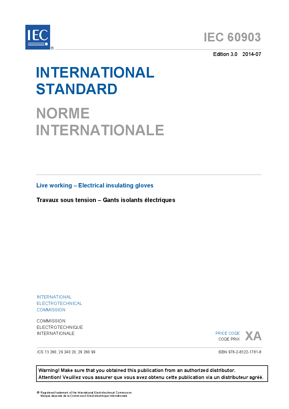 IEC 60903:2014 Live working - Electrical insulating gloves