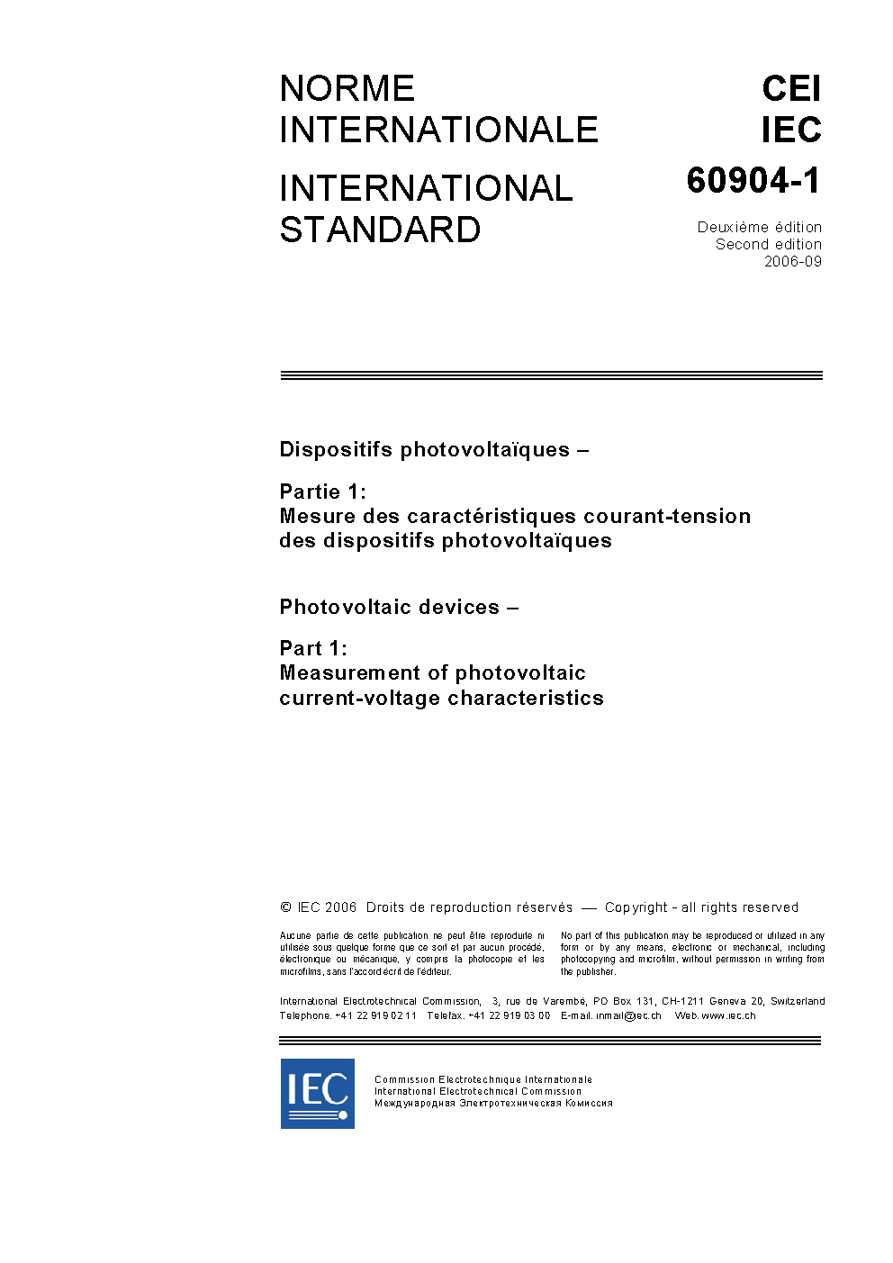 IEC 60904-1:2020 describes procedures for the measurement of current-voltage characteristics (_I-V_ curves) of photovoltaic (PV) devices in natural or simulated sunlight. These procedures are applicable to a single PV solar cell, a sub-assembly of PV solar cells, or a PV module. This document is applicable to non-concentrating PV devices for use in terrestrial environments, with reference to (usually but not exclusively) the global reference spectral irradiance AM1.5 defined in IEC 60904-3.