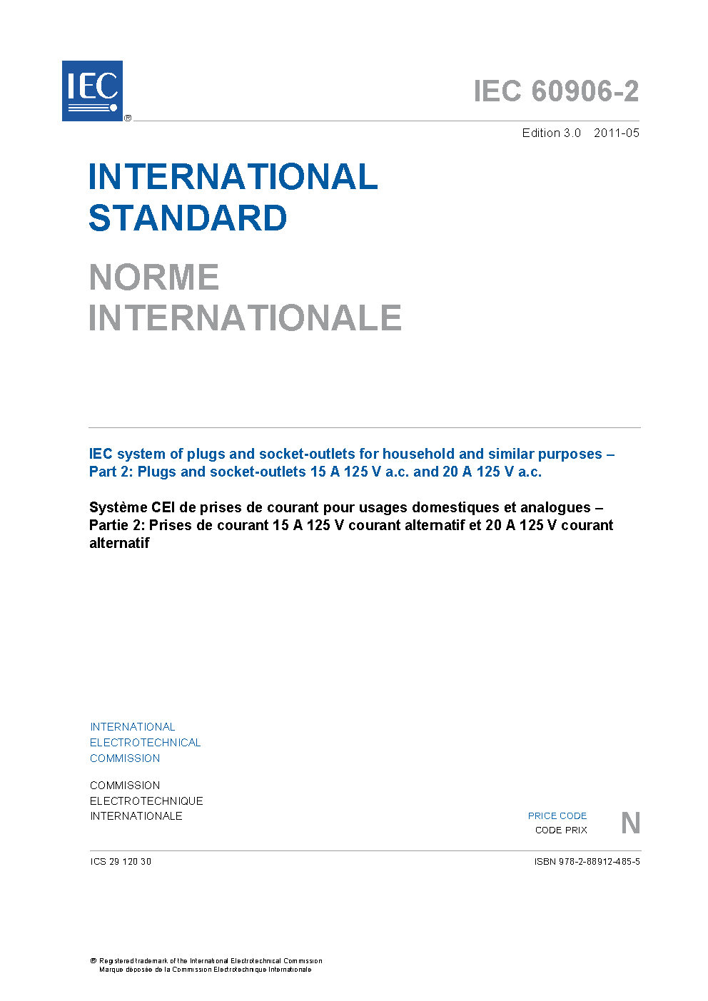 IEC 60906-2:2011 IEC system of plugs and socket-outlets for household and similar purposes - Part 2: Plugs and socket-outlets 15 A 125 V a.c. and 20 A 125 V a.c.