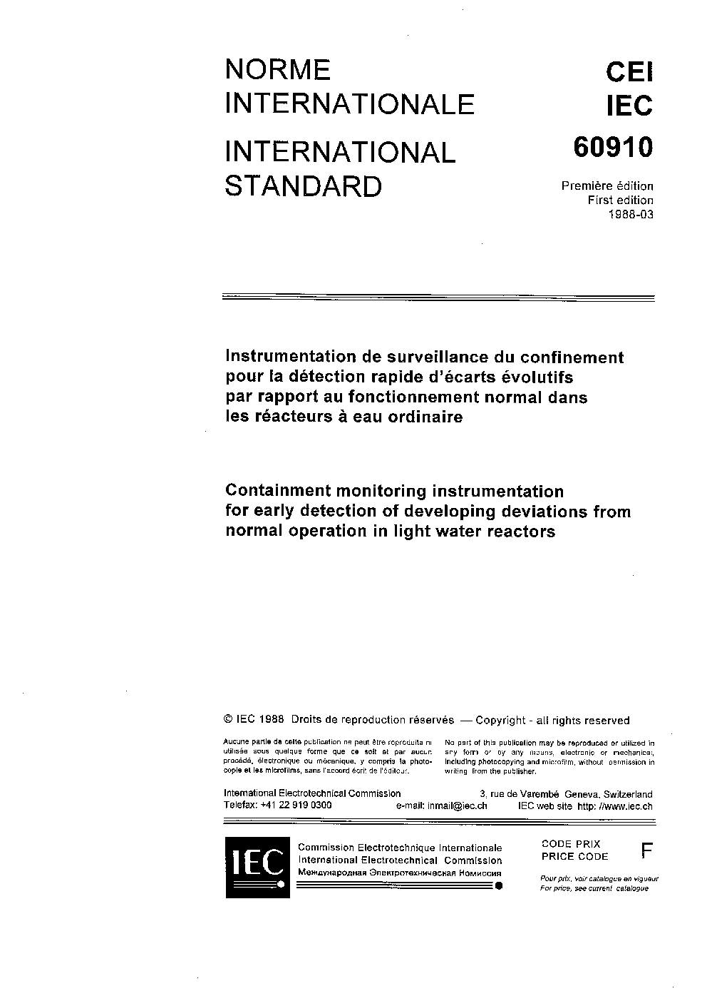 IEC 60910:2022 provides requirements for primary and secondary containment parameter monitoring that enable the operator to identify developing deviations from normal operation. The operator can then take corrective action at an early stage to prevent a minor failure from developing into a serious plant failure or an accident condition. This document is directed towards monitoring the primary and secondary containment under normal conditions only.