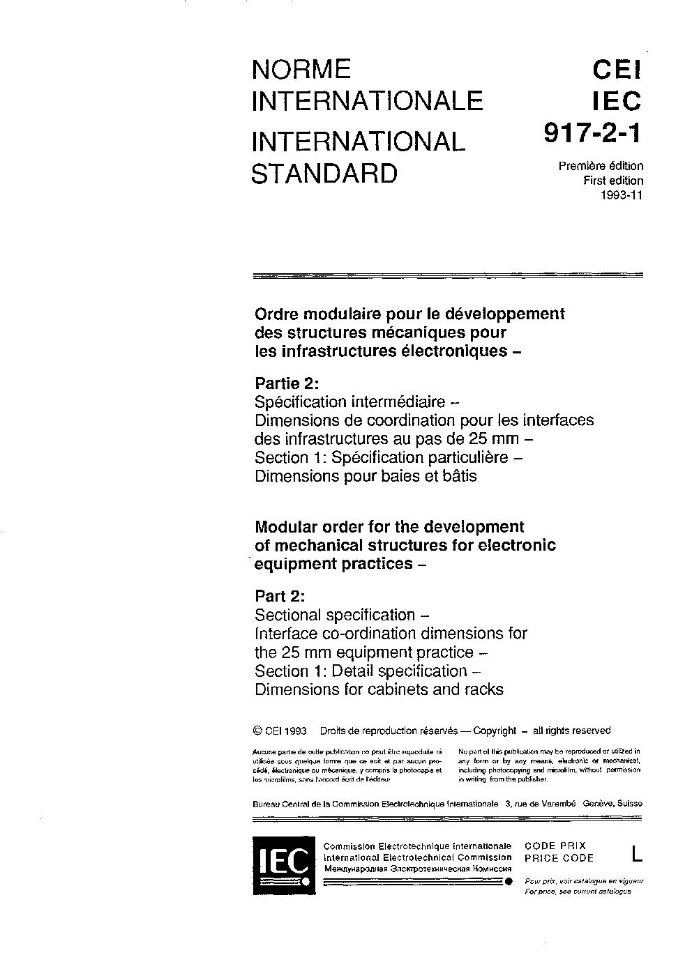 IEC 60917-2-1:1993 Modular order for the development of mechanical structures for electronic equipment practices - Part 2: Sectional specification - Interface co-ordination dimensions for the 25 mm equipment practice - Section 1: Detail specification - Dimensions for cabinets and racks