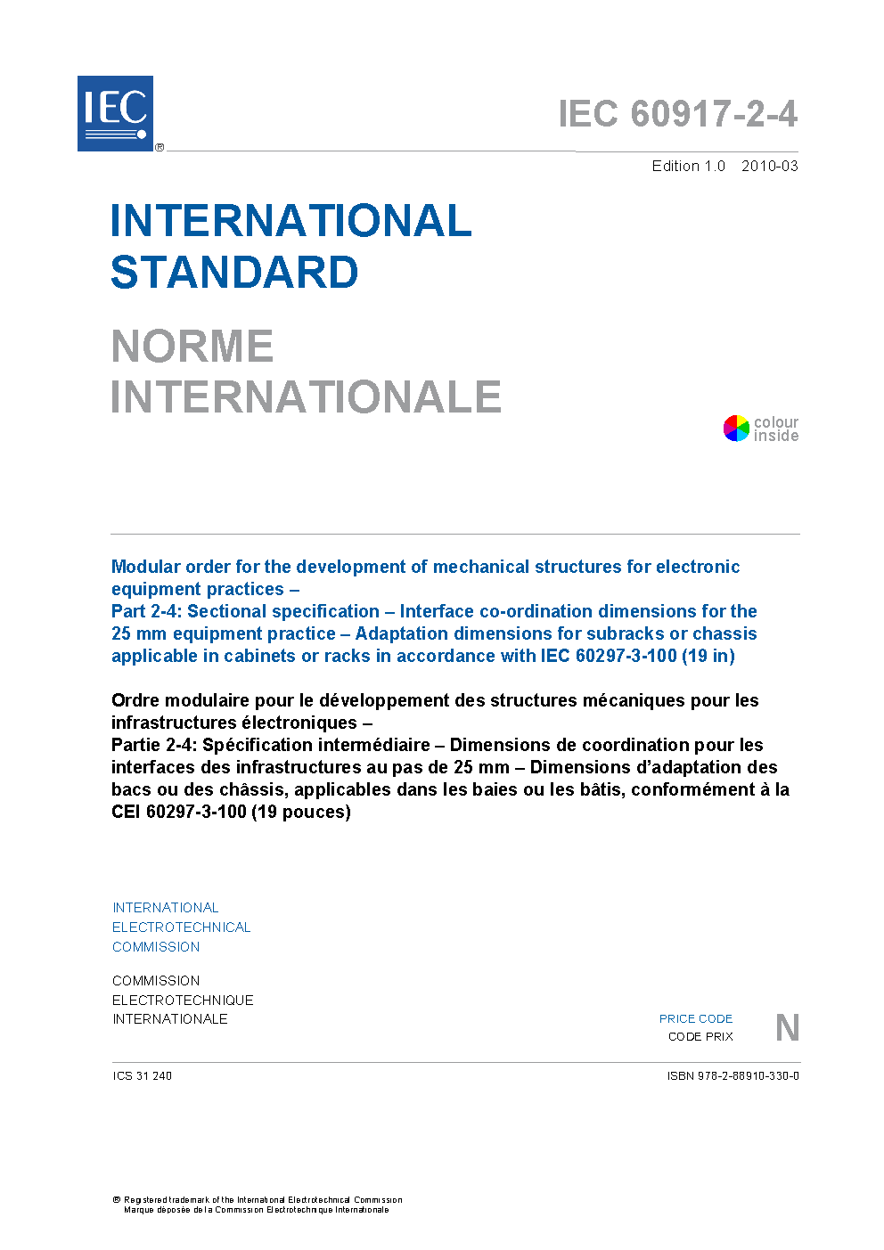 IEC 60917-2-4:2010 Modular order for the development of mechanical structures for electronic equipment practices - Part 2-4: Sectional specification - Interface co-ordination dimensions for the 25 mm equipment practice - Adaptation dimensions for subracks or chassis applicable in cabinets or racks in accordance with IEC 60297-3-100 (19 in)