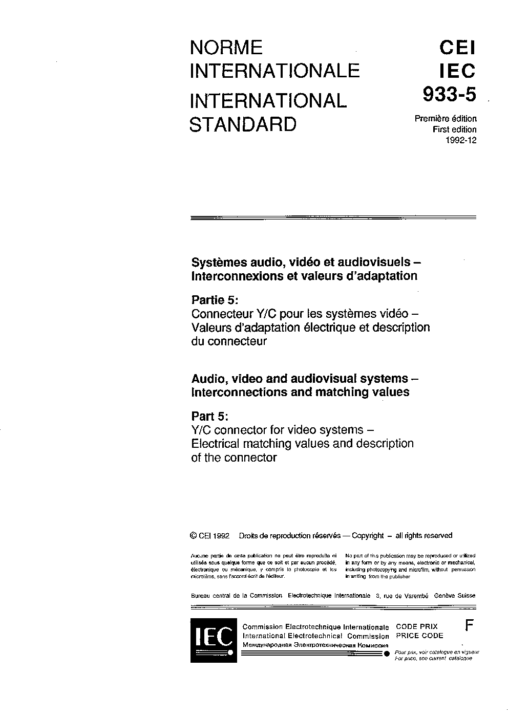 IEC 60933-5:1992 Audio, video and audiovisual systems - Interconnections and matching values - Part 5: Y/C connector for video systems - Electrical matching values and description of the connector