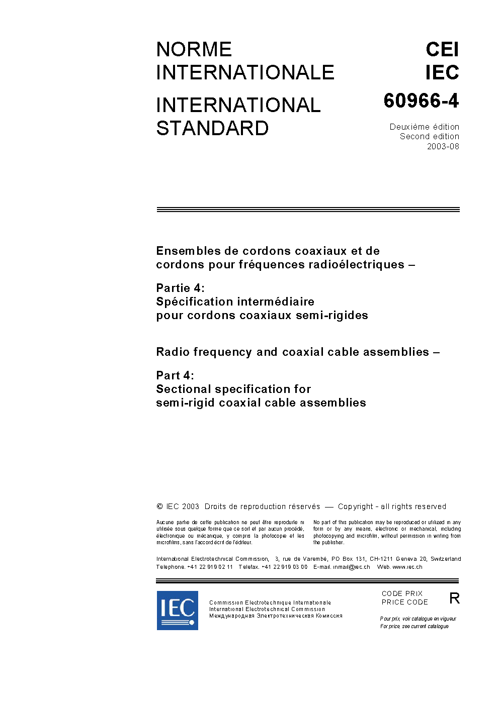 This part of IEC 60966 applies to semi-rigid cable assemblies composed of semi-rigid coaxial cables and coaxial connectors. Semi-rigid cable assemblies are widely used in mobile communication systems, microwave test equipment, radar, aerospace and other fields.