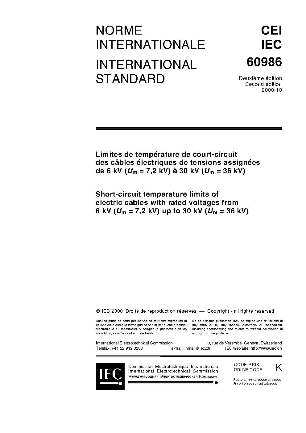 IEC 60986:2000 Short-circuit temperature limits of electric cables with rated voltages from 6 kV (Um = 7,2 kV) up to 30 kV (Um = 36 kV)