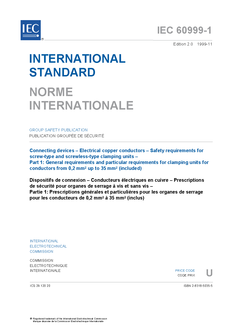IEC 60999-1:1999 Applies to screw-type and screwless-type clamping units for connecting devices, either as separate entities or as integral parts of equipment, for the connection of electrical copper conductors (complying with IEC 60228), rigid (solid or stranded) and/or flexible, having a cross-sectional area of 0.5 mm2 up to and including 35 mm2 and equivalent AWG sizes with a rated voltage not exceeding 1 000 V a.c. with a frequency up to and including 1 000 Hz, and 1 500 V d.c.