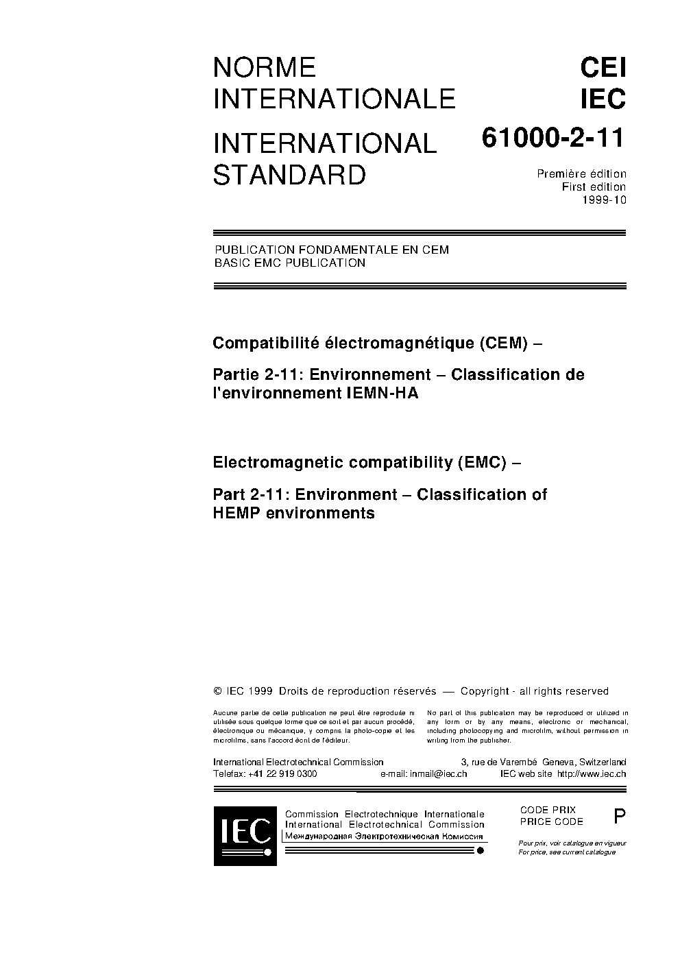 IEC 61000-2-11:1999 Electromagnetic compatibility (EMC) - Part 2-11: Environment - Classification of HEMP environments