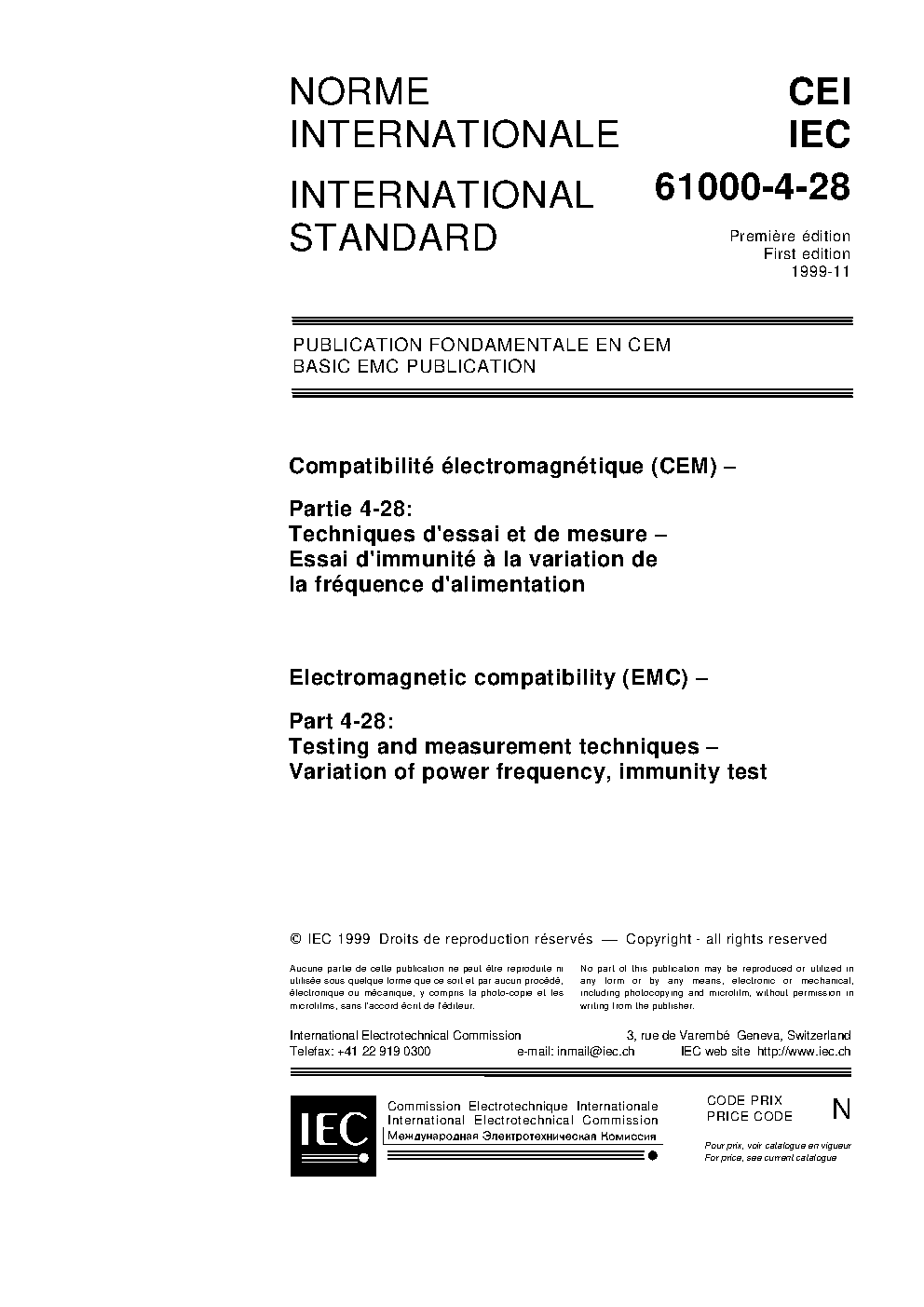 IEC 61000-4-28:1999 Electromagnetic compatibility (EMC) - Part 4-28: Testing and measurement techniques - Variation of power frequency, immunity test