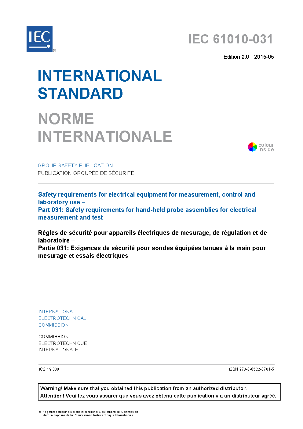 This third edition cancels and replaces the second edition published in 2015, and Amendment 1:2018. IEC 61010-031 is a stand-alone standard. This edition includes the following significant technical changes with respect to the previous edition: