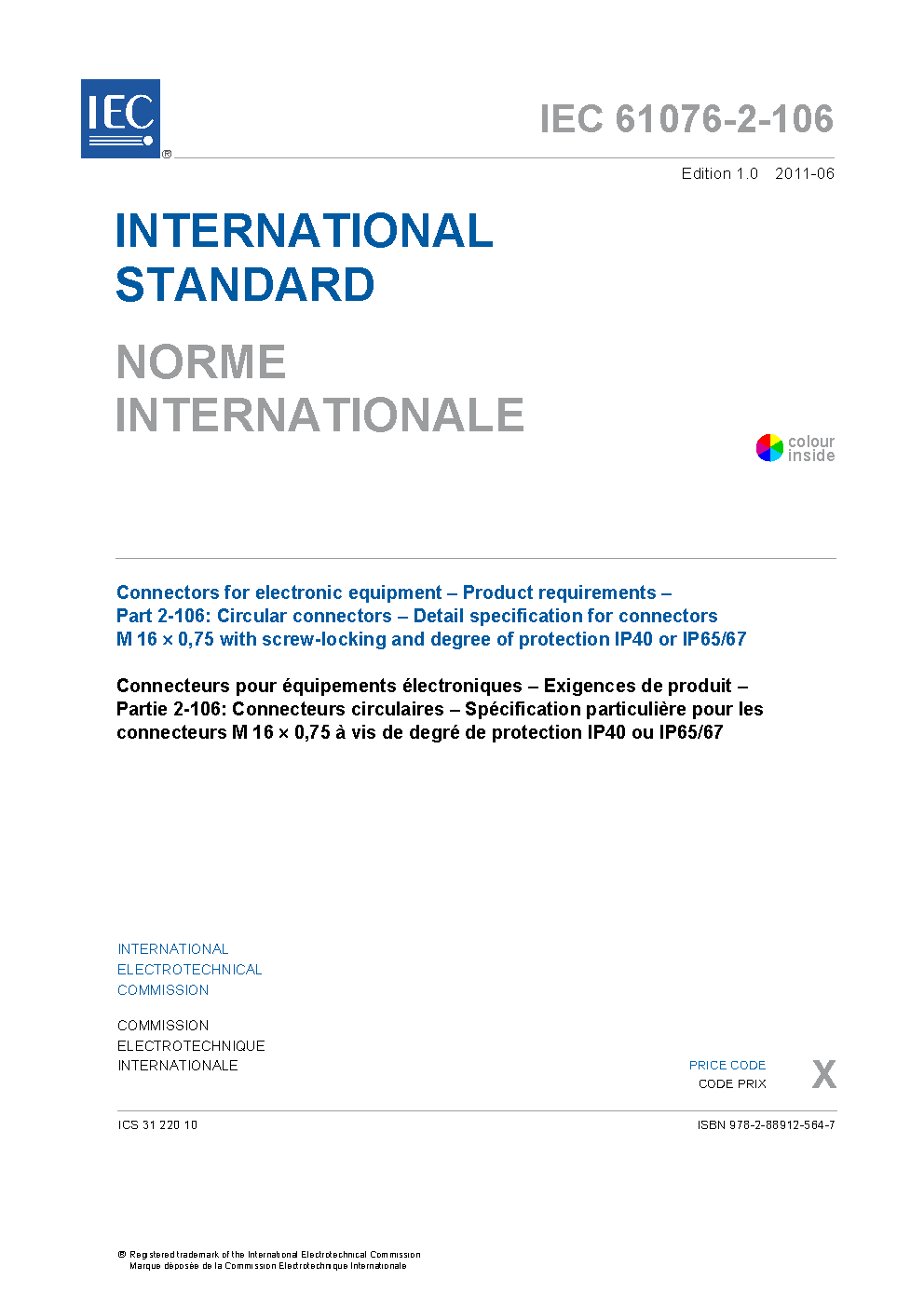 IEC 61076-2-106:2011 Connectors for electronic equipment - Product requirements - Part 2-106: Circular connectors - Detail specification for connectors M 16 x 0,75 with screw-locking and degree of protection IP40 or IP65/67