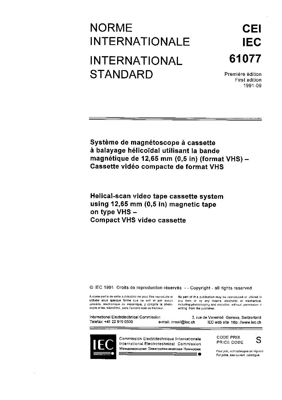IEC 61077:1991 Helical-scan video tape cassette system using 12.65 mm (0.5 in) magnetic tape on type VHS - Compact VHS video cassette