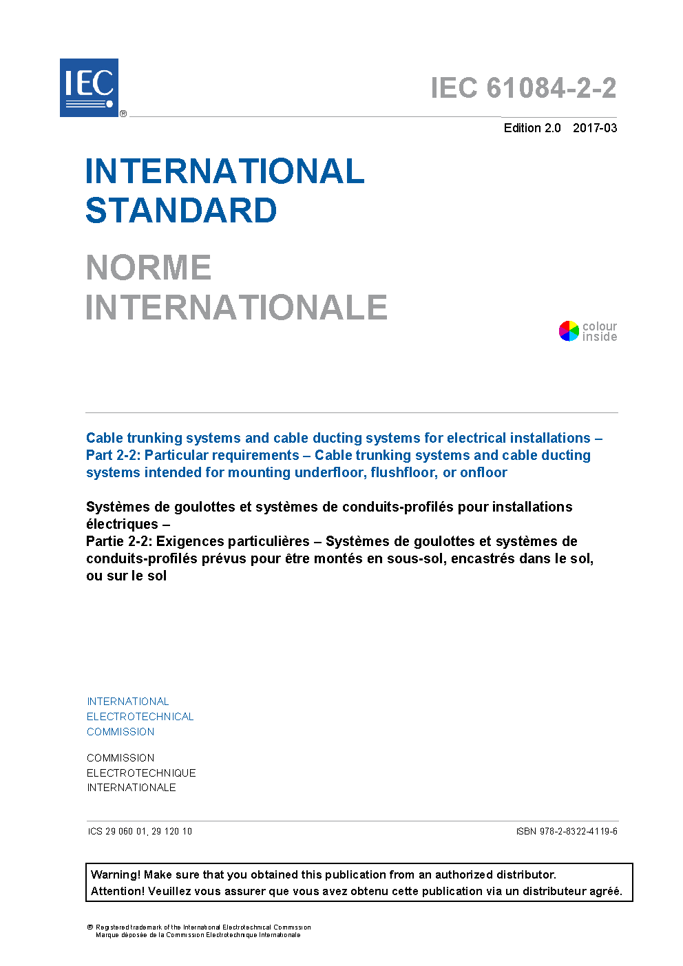 IEC 61084-2-2:2017 specifies requirements and tests for cable trunking systems (CTS) and cable ducting systems (CDS) intended for the accommodation, and where necessary for the electrically protective separation, of insulated conductors, cables and possibly other electrical equipment in electrical and/or communication systems installations. The maximum voltage of these installations is 1 000 V AC and 1 500 V DC.