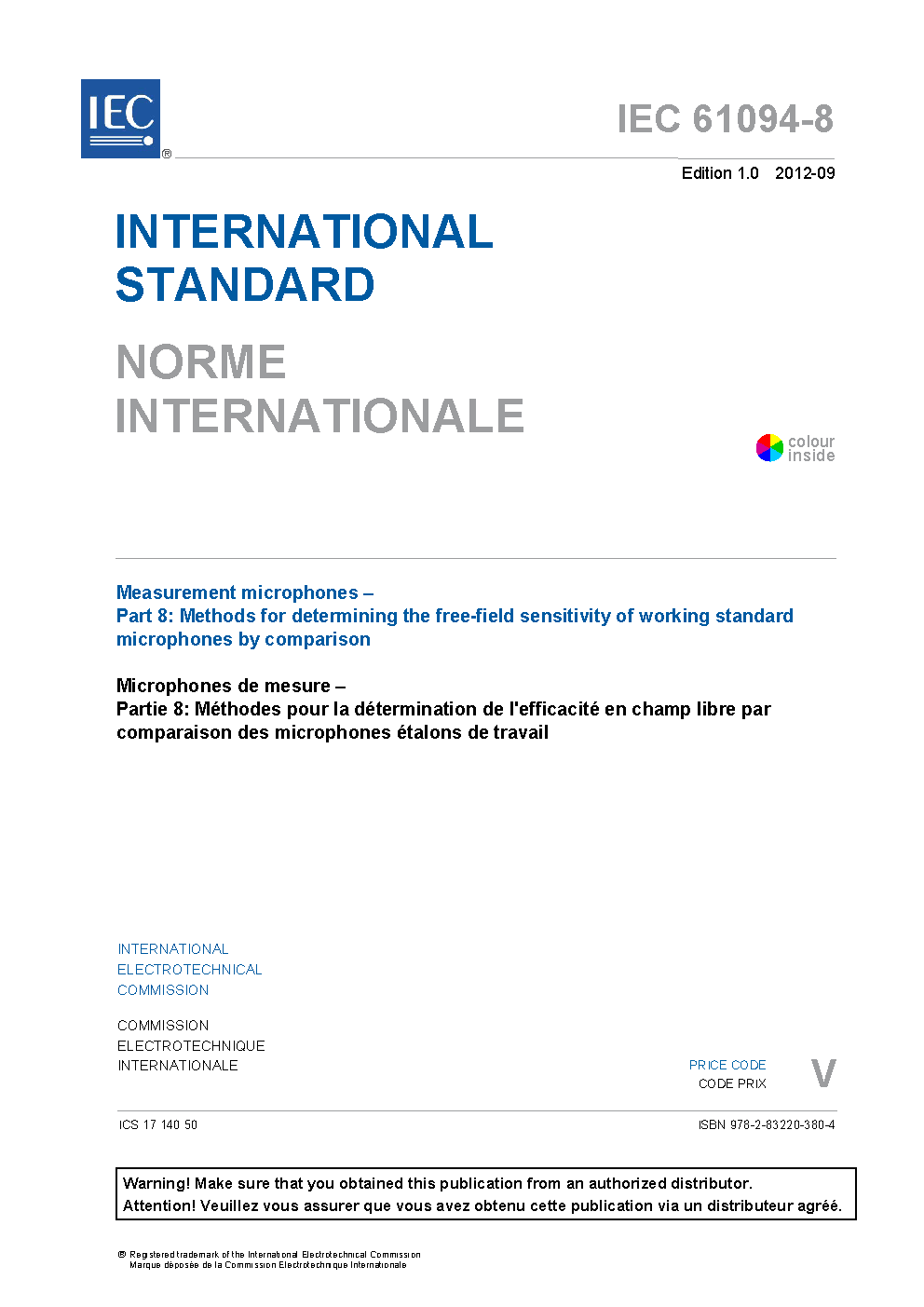 IEC 61094-8:2012 Measurement microphones - Part 8: Methods for determining the free-field sensitivity of working standard microphones by comparison