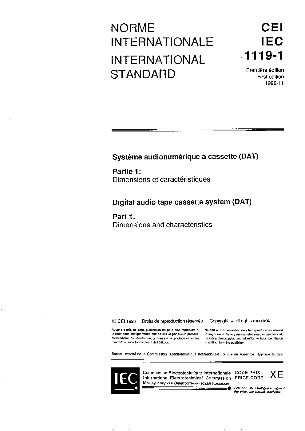 IEC 61119-1:1992 Digital audio tape cassette system (DAT) - Part 1: Dimensions and characteristics