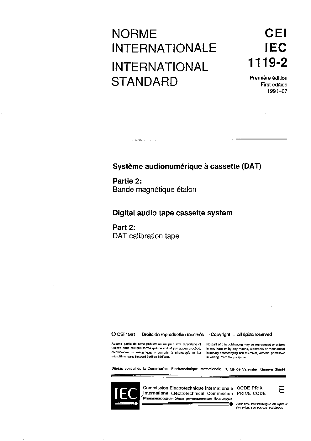 IEC 61119-2:1991 Digital audio tape cassette system - Part 2: DAT calibration tape