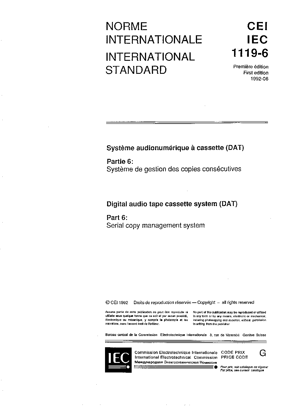 IEC 61119-6:1992 Digital audio tape cassette system (DAT) - Part 6: Serial copy management system