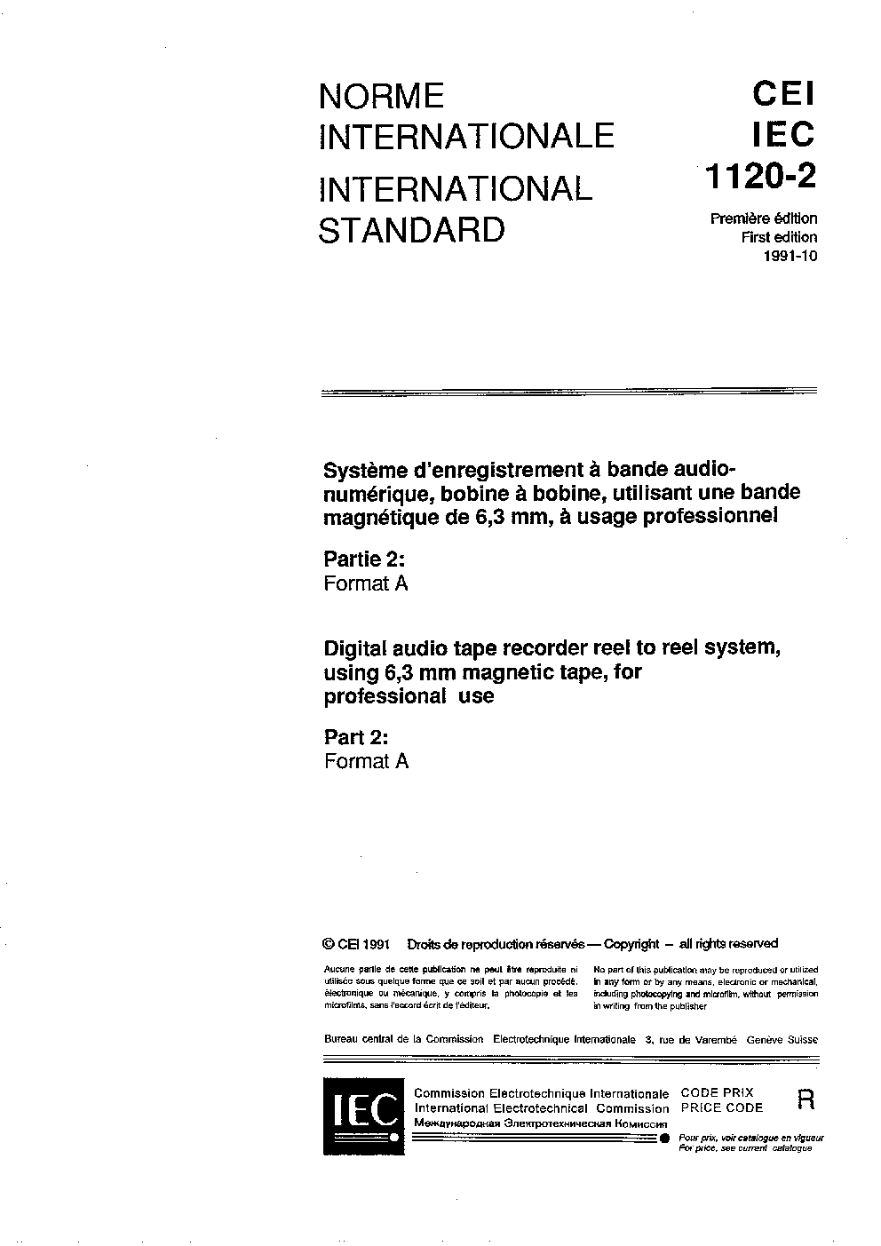 IEC 61120-2:1991 Digital audio tape recorder reel to reel system, using 6.3 mm magnetic tape, for professional use - Part 2: Format A