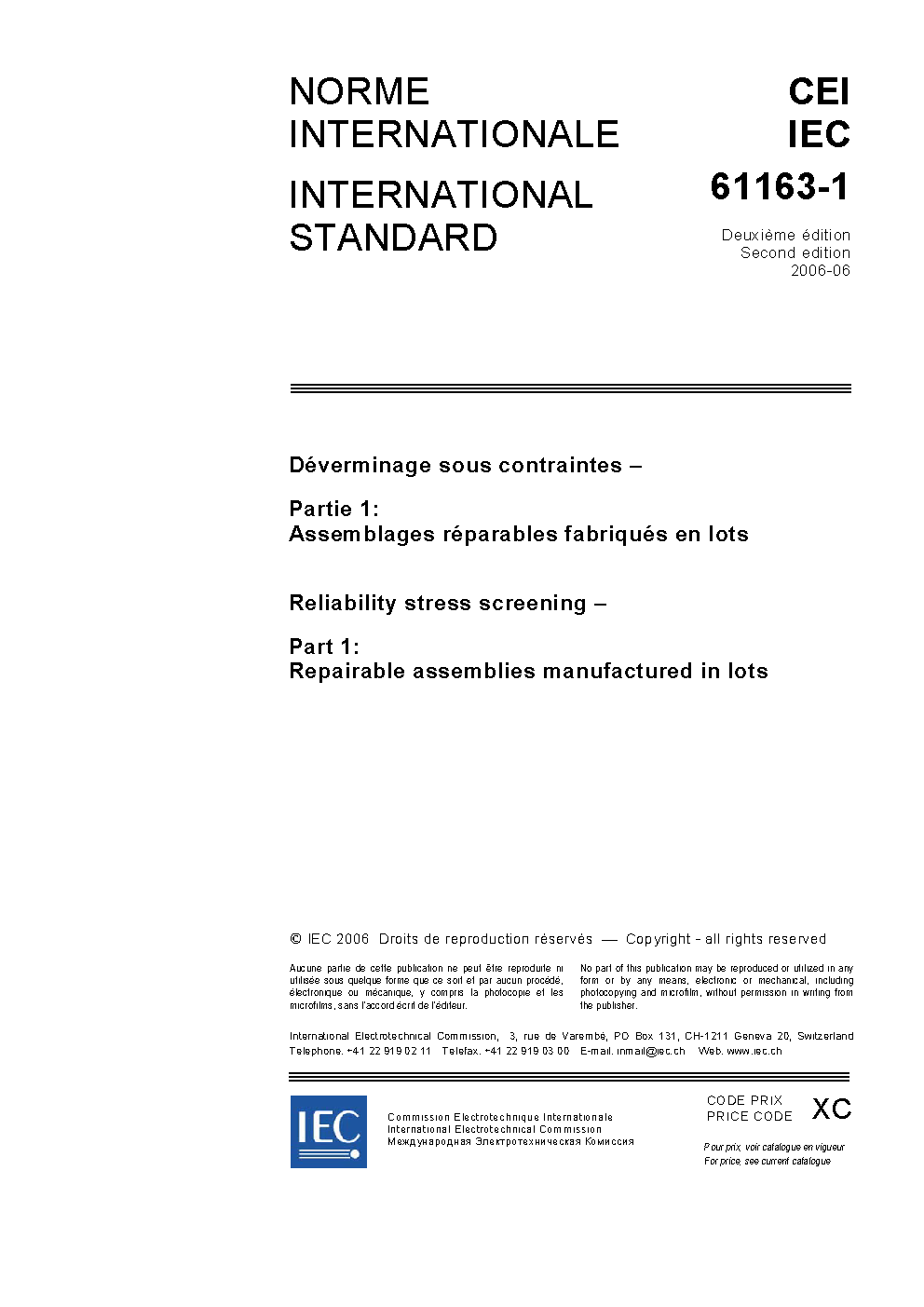 IEC 61163-1:2006 Reliability stress screening - Part 1: Repairable assemblies manufactured in lots