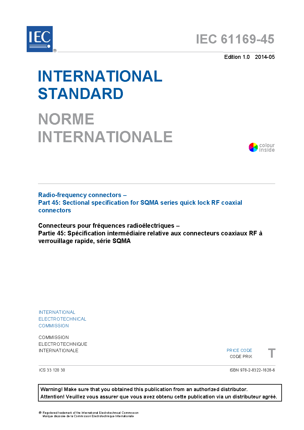 IEC 61169-45:2014 Radio-frequency connectors - Part 45: Sectional specification for SQMA series quick lock RF coaxial connectors