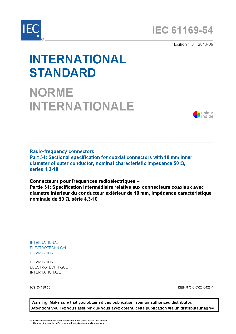 IEC 61169-54:2021 Radio frequency connectors - Part 54: Sectional specification for coaxial connectors with 10 mm inner diameter of outer conductor, nominal characteristic impedance 50 ?, Series 4,3-10