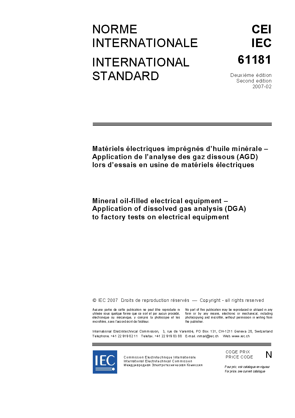 IEC 61181:2007 Mineral oil-filled electrical equipment - Application of dissolved gas analysis (DGA) to factory tests on electrical equipment