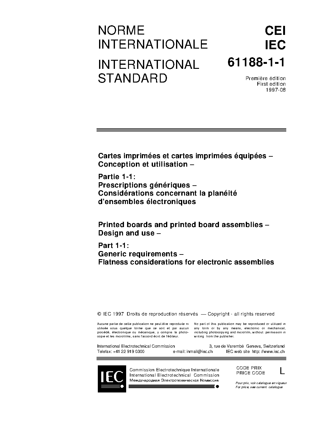 IEC 61188-1-1:1997 Printed boards and printed board assemblies - Design and use - Part 1-1: Generic requirements - Flatness considerations for electronic assemblies