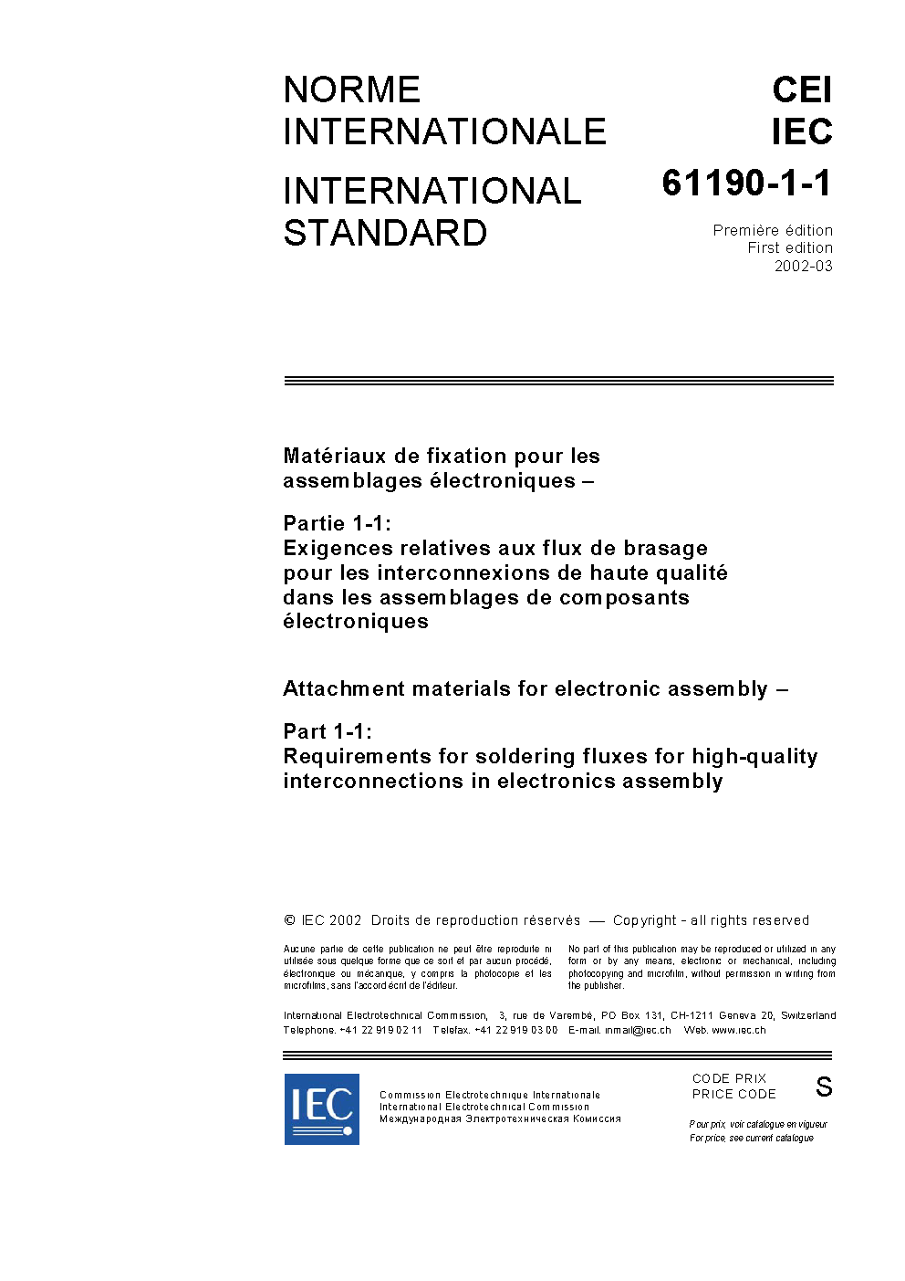 IEC 61190-1-1:2002 Attachment materials for electronic assembly - Part 1-1: Requirements for soldering fluxes for high-quality interconnections in electronics assembly