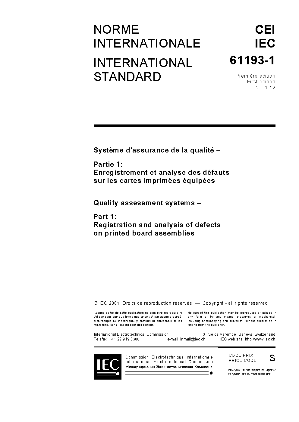 IEC 61193-1:2001 Quality assessment systems - Part 1: Registration and analysis of defects on printed board assemblies