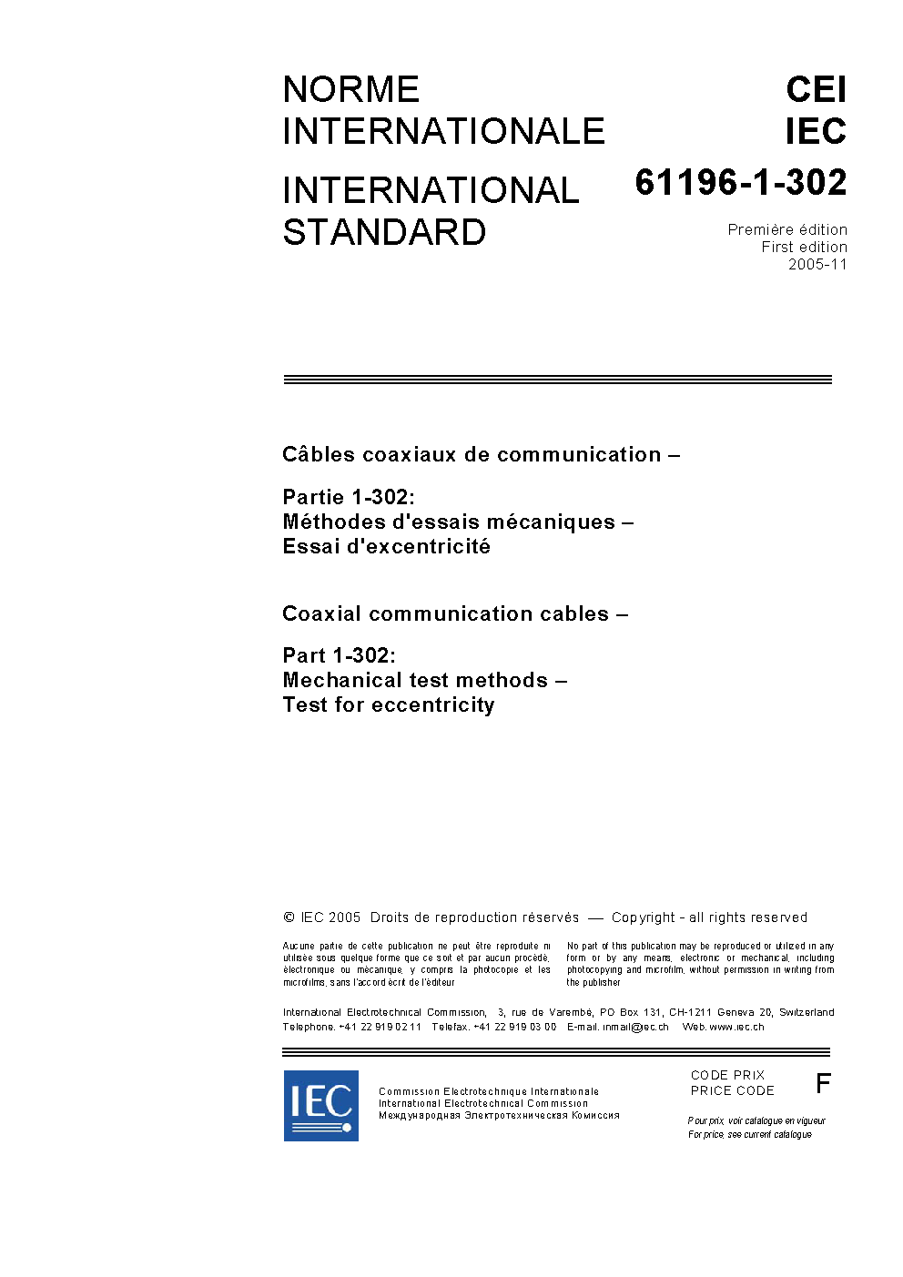 IEC 61196-1-302:2005 Coaxial communication cables - Part 1-302: Mechanical test methods - Test for eccentricity
