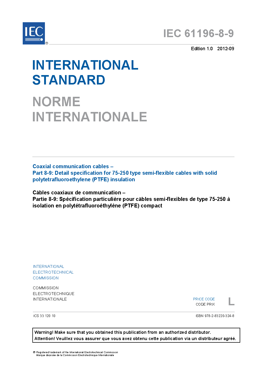 IEC 61196-8-9:2012 Coaxial communication cables - Part 8-9: Detail specification for 75-250 type semi-flexible cables with solid polytetrafluoroethylene (PTFE) insulation
